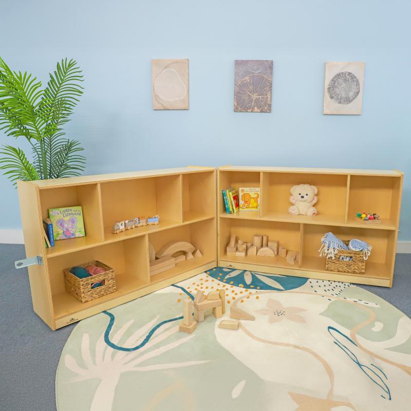 Compact mobile storage! When every inch of space counts -- when doesn't it? -- you'll appreciate how this 30-in hinged storage cabinet opens into two plentiful mirror-image storage cabinets, then closes and locks like a clamshell and rolls out of the way or can be used as a table or counter. Need a different height? Check out our WB0552 Toddler 24-inch Tall Fold and Roll Storage Cabinet [sold separately]. Constructed in beautiful, durable birch plywood in safe, non-toxic natural UV finish that won't yellow and withstands rigorous use. Made in USA. GreenGuard™ Gold certified. Lifetime Warranty. Certified antimicrobial.